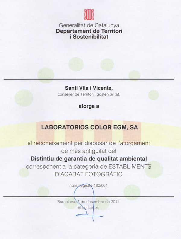 Como empresa pionera en el sector fotográfico en comprometerse con sus responsabilidades medioambientales, EGM ha recibido por parte de la Generalitat de Catalunya el reconocimiento de ser la empresa con más antigüedad del sector fotográfico en posesión del Distintivo de Garantía de Calidad Ambiental correspondiente a la categoría de establecimiento de acabados fotográficos.